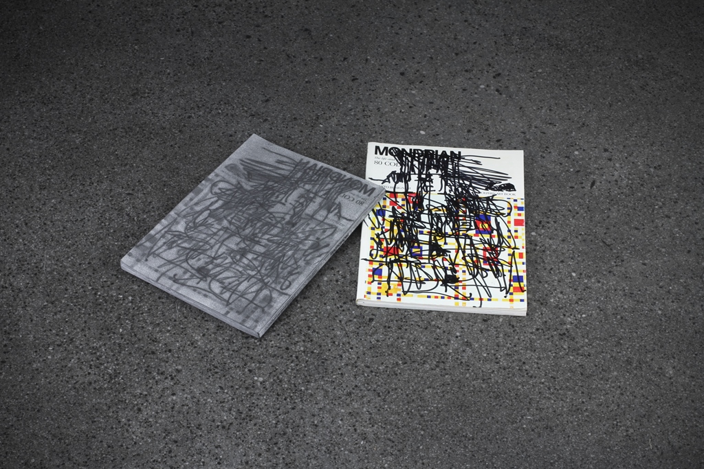 graphite on paper, marker on found book
