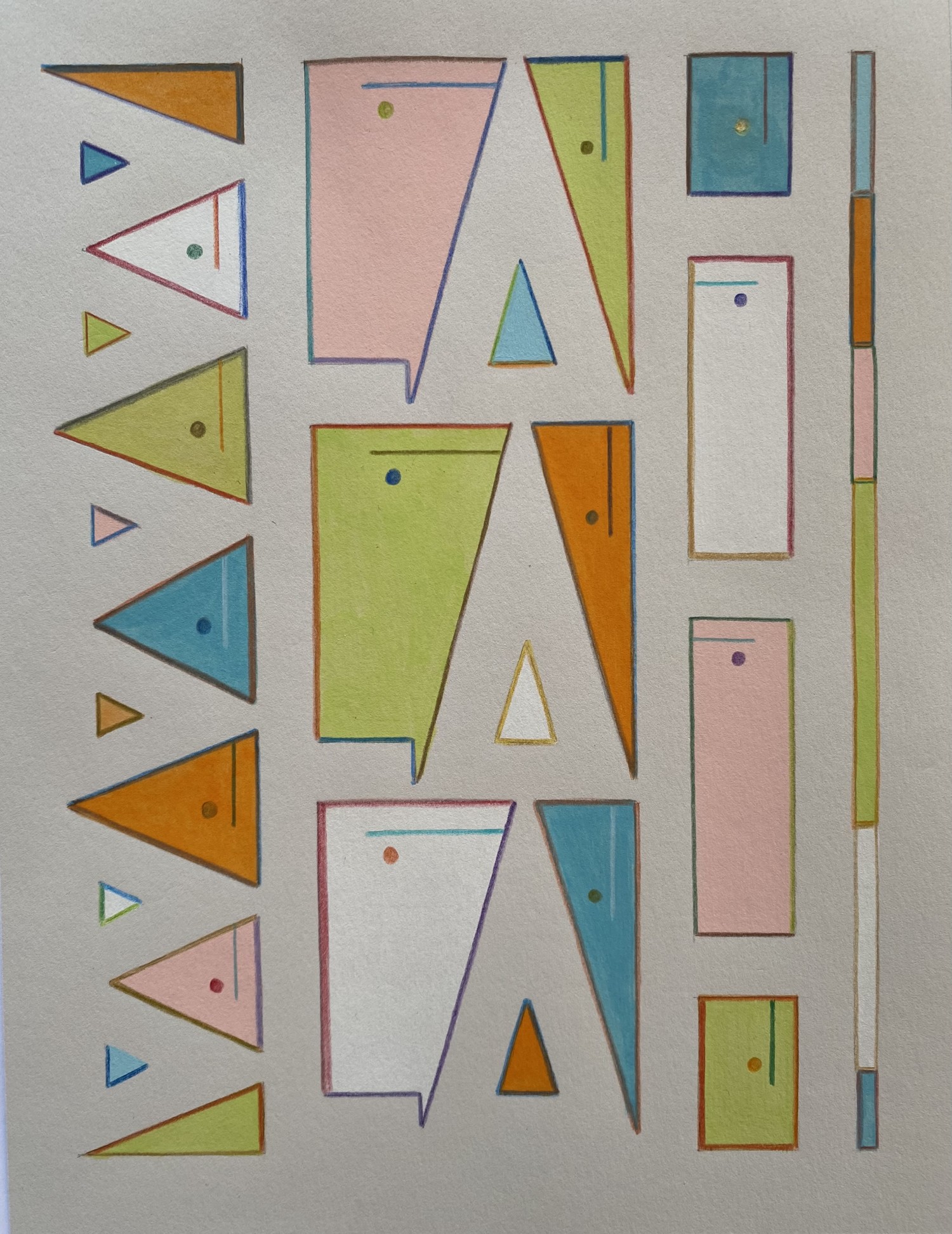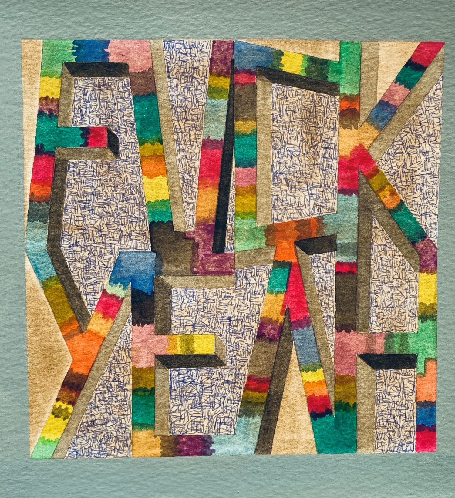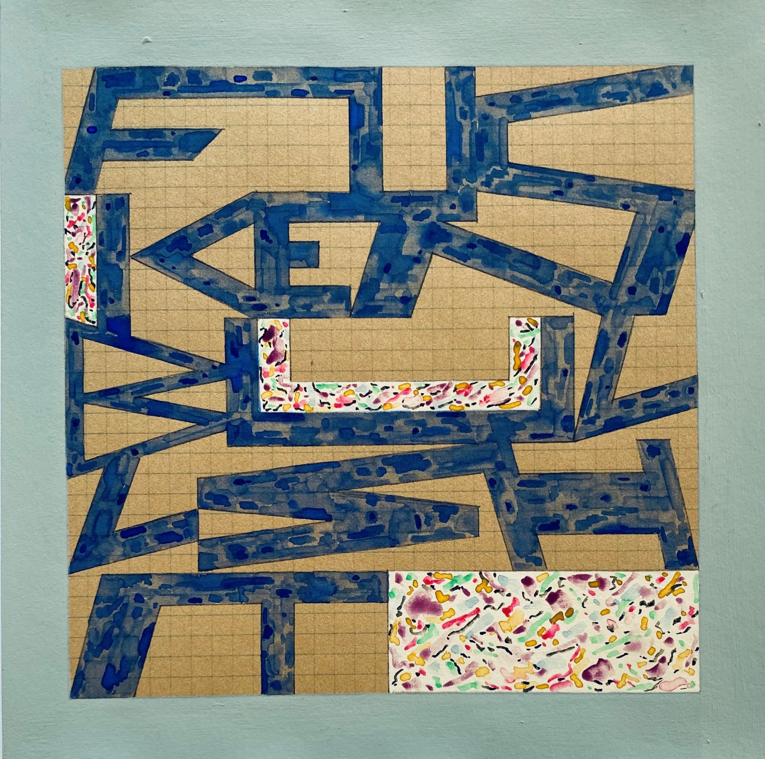 ink, coloured pencil, watercolour, collage, inkjet print, acrylic paint on paper