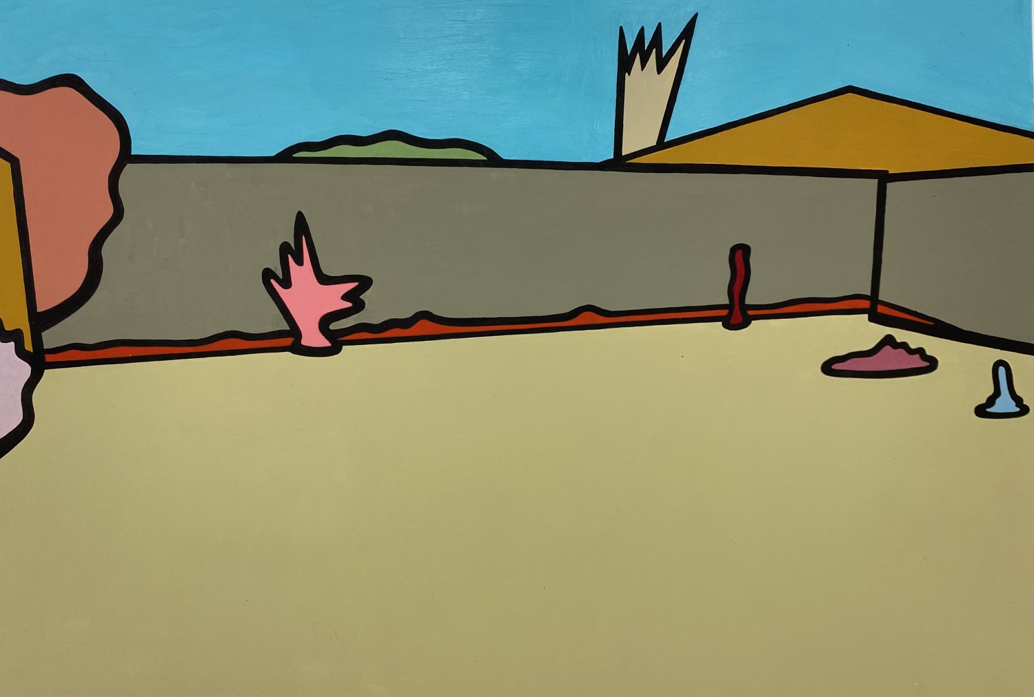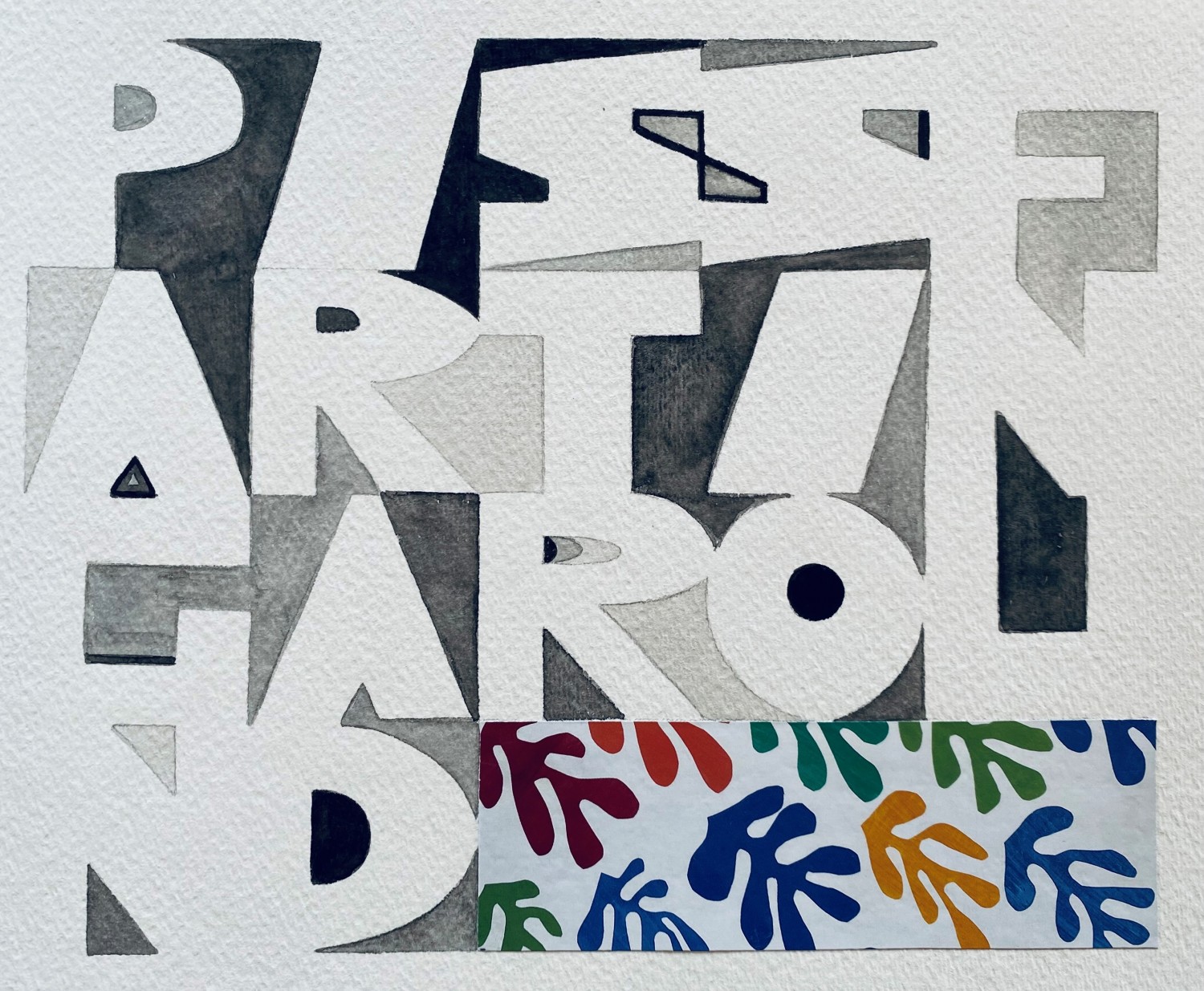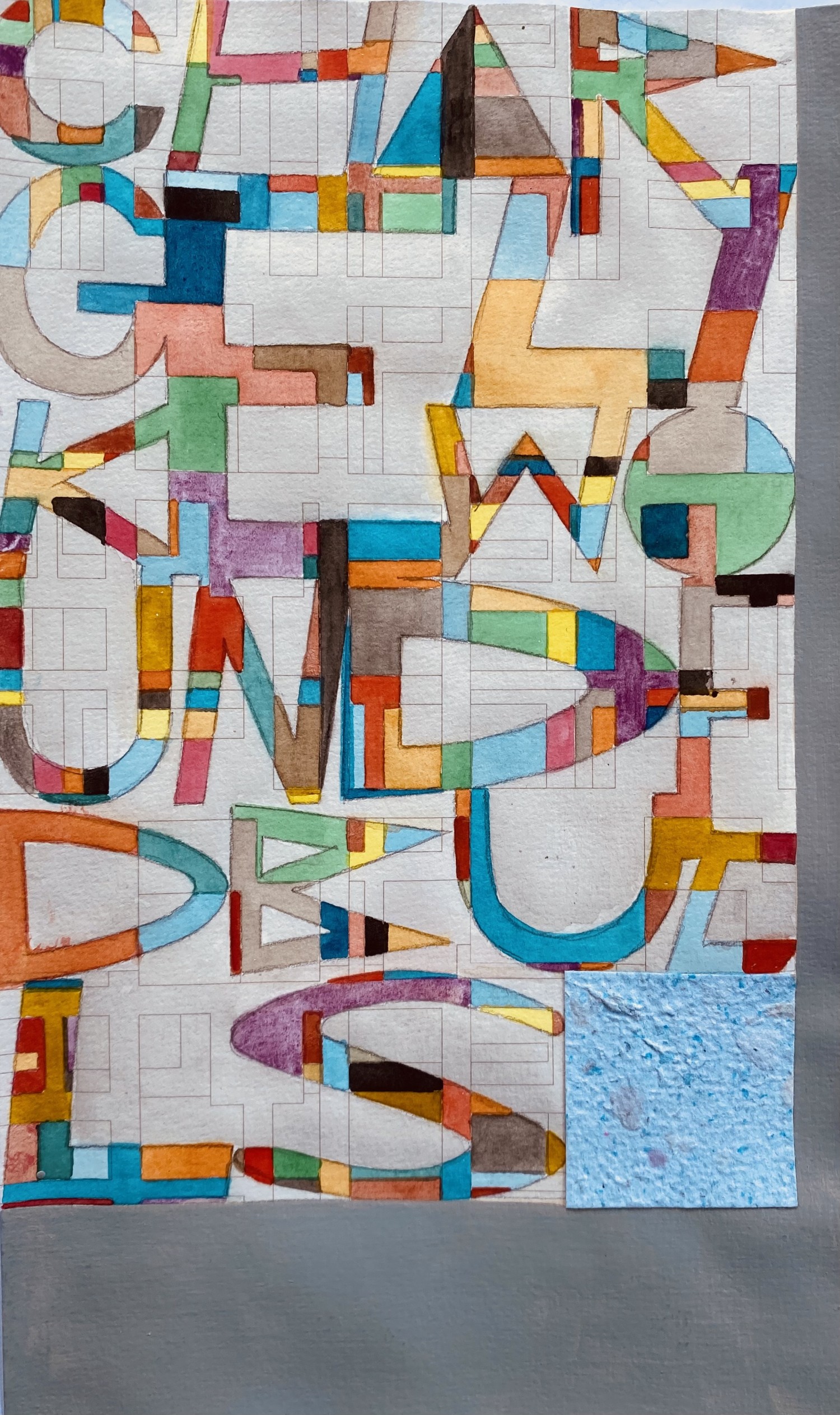 pencil, watercolour, collage, acrylic paint, printed on paper