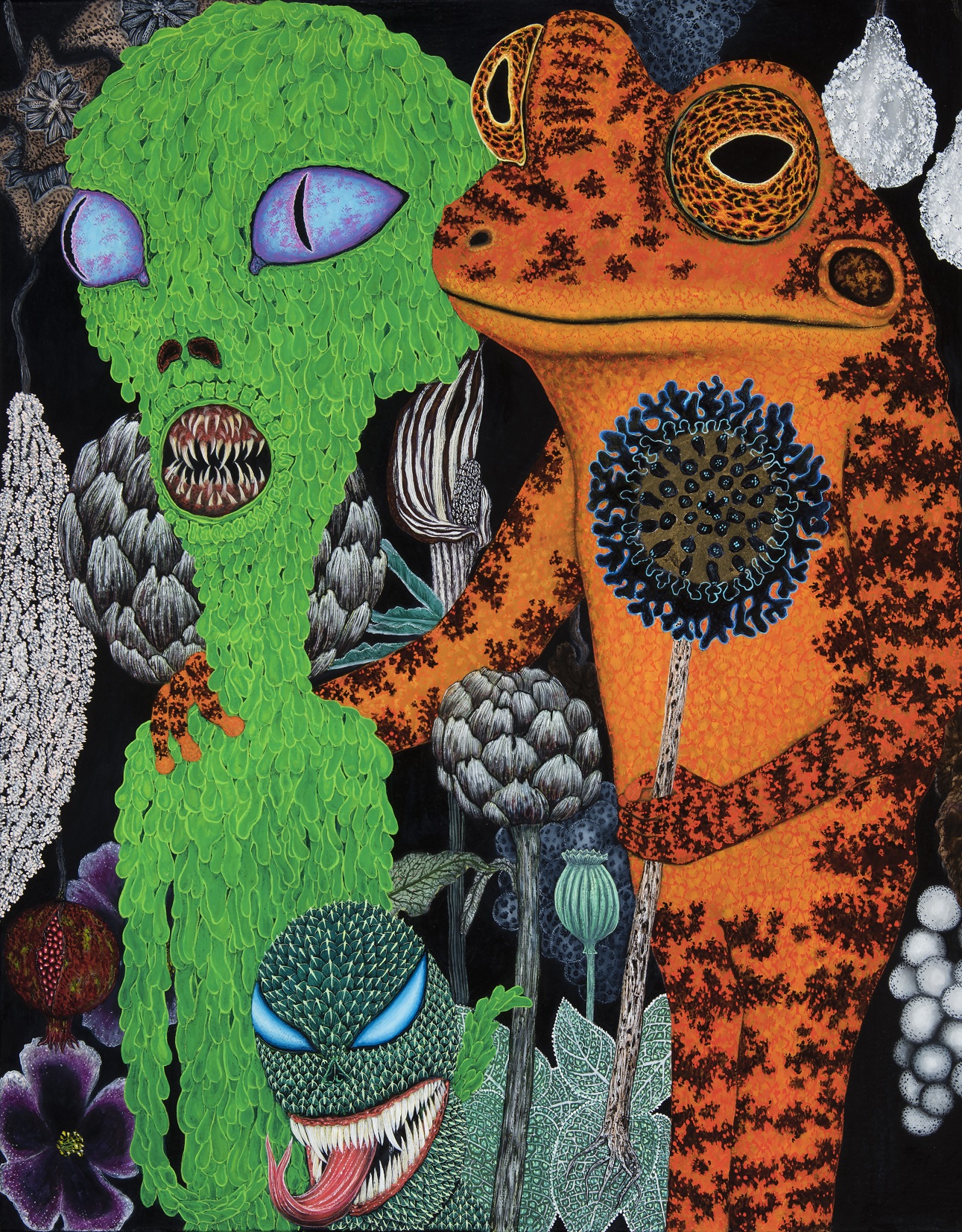 hand-crocheted wool and strands of human hair over gourd, wood, synthetic polymer emulsion