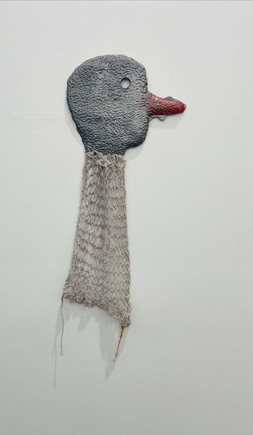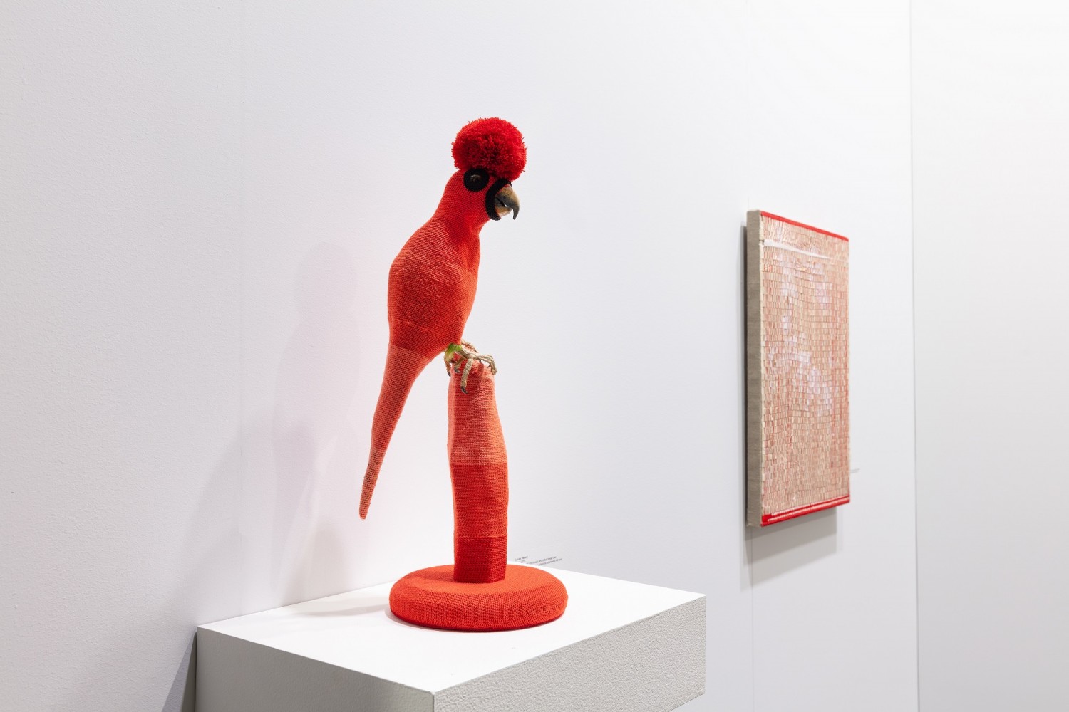 Hand crocheted lamb’s wool and cotton thread over taxidermy Red-lored parrot (Amazona autumnalis) felt and wood