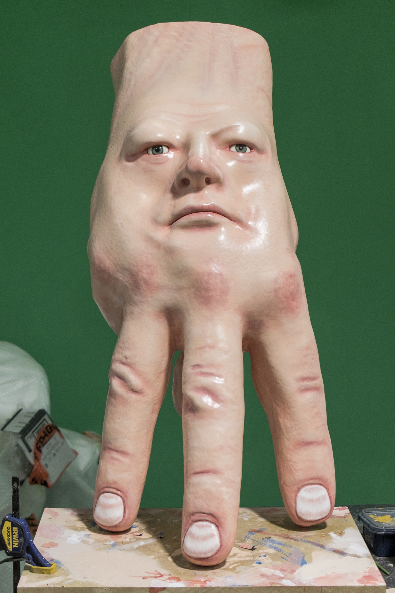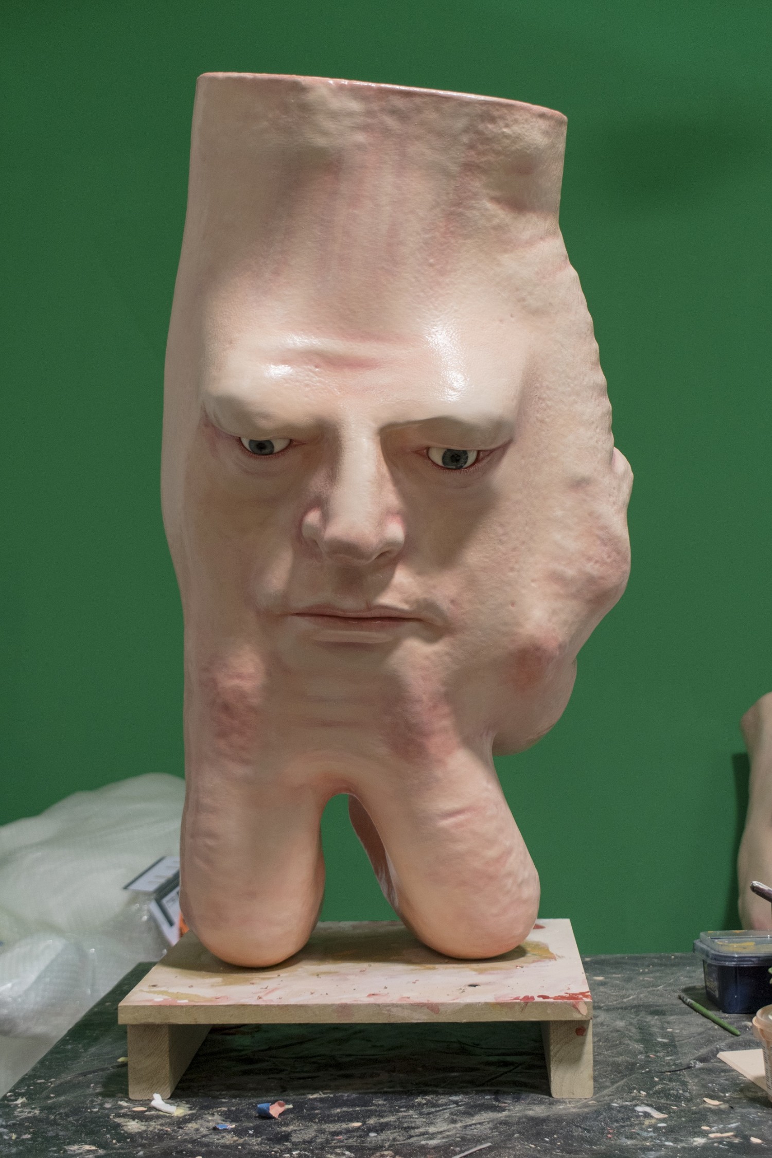 3D printed resin, paint, prosthetic eyes, stand