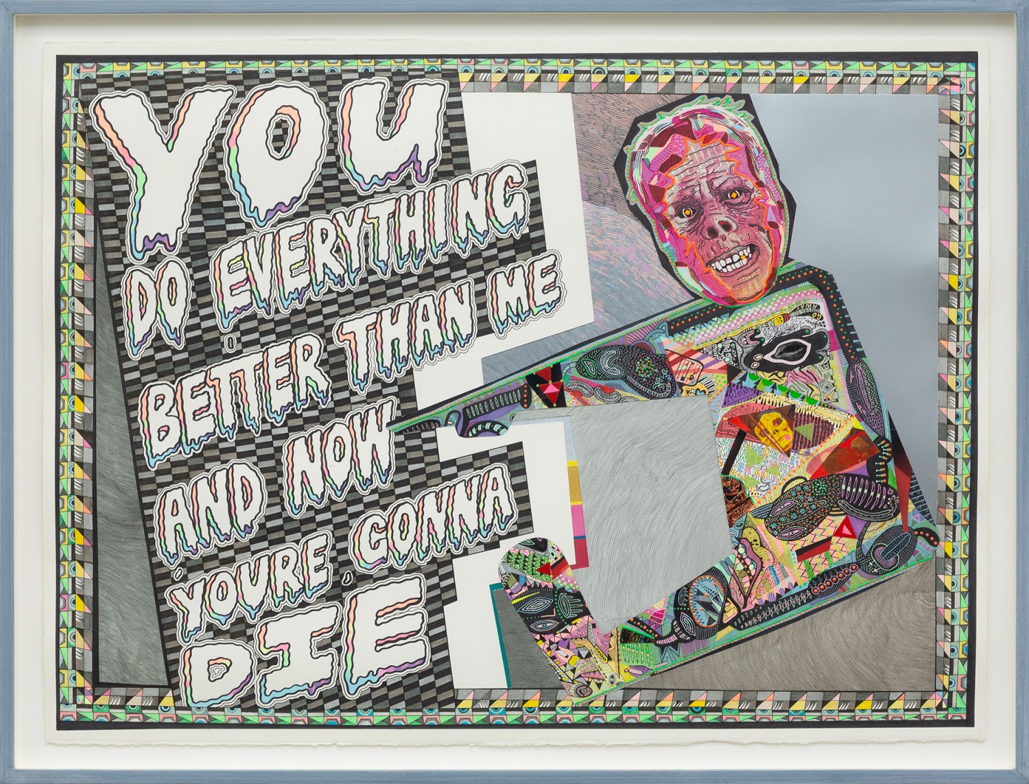 Pen, felt tips, collage, flourescent pva glue on paper, coloured card