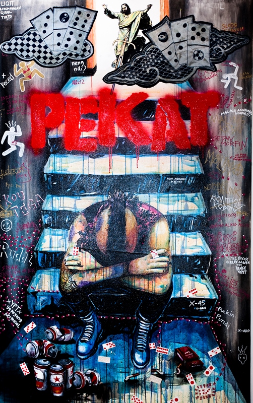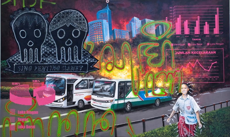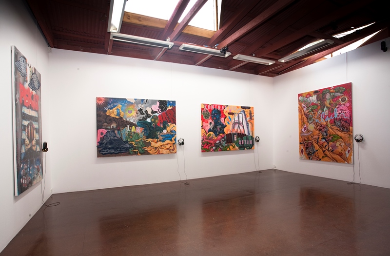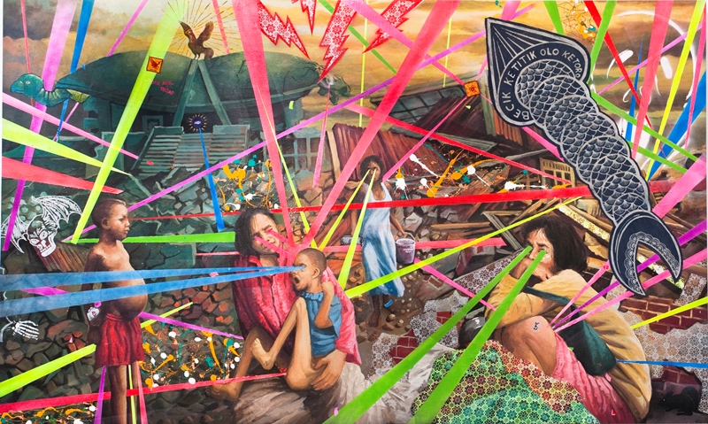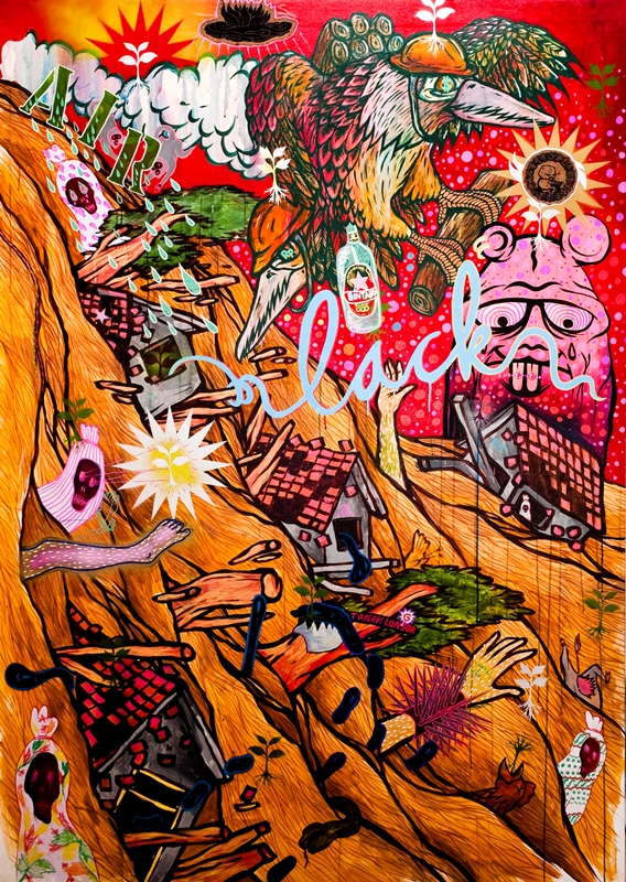 acrylic, oil pastel, batik, aerosol spray, oil paint marker on canvas