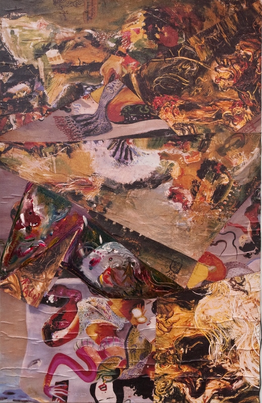acrylic, marker paint, playing card collage, silk screen, batik fabric collage on canvas