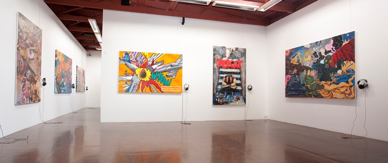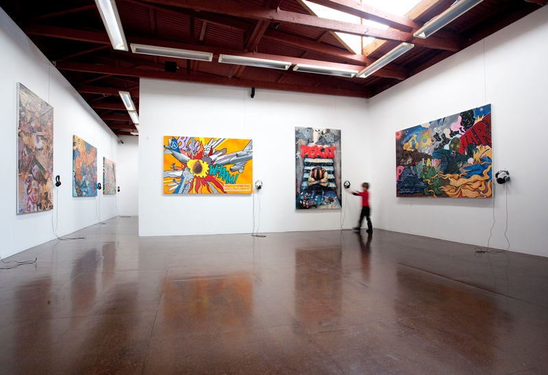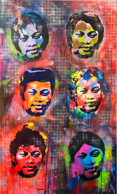 acrylic, batik, scout badges, silk screen, aerosol spray, oil paint marker on canvas
