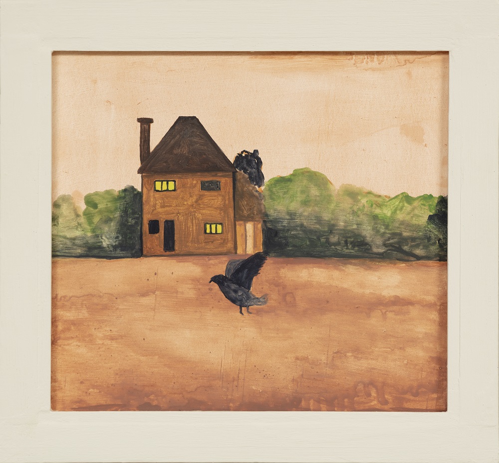 Dark bird in front of home