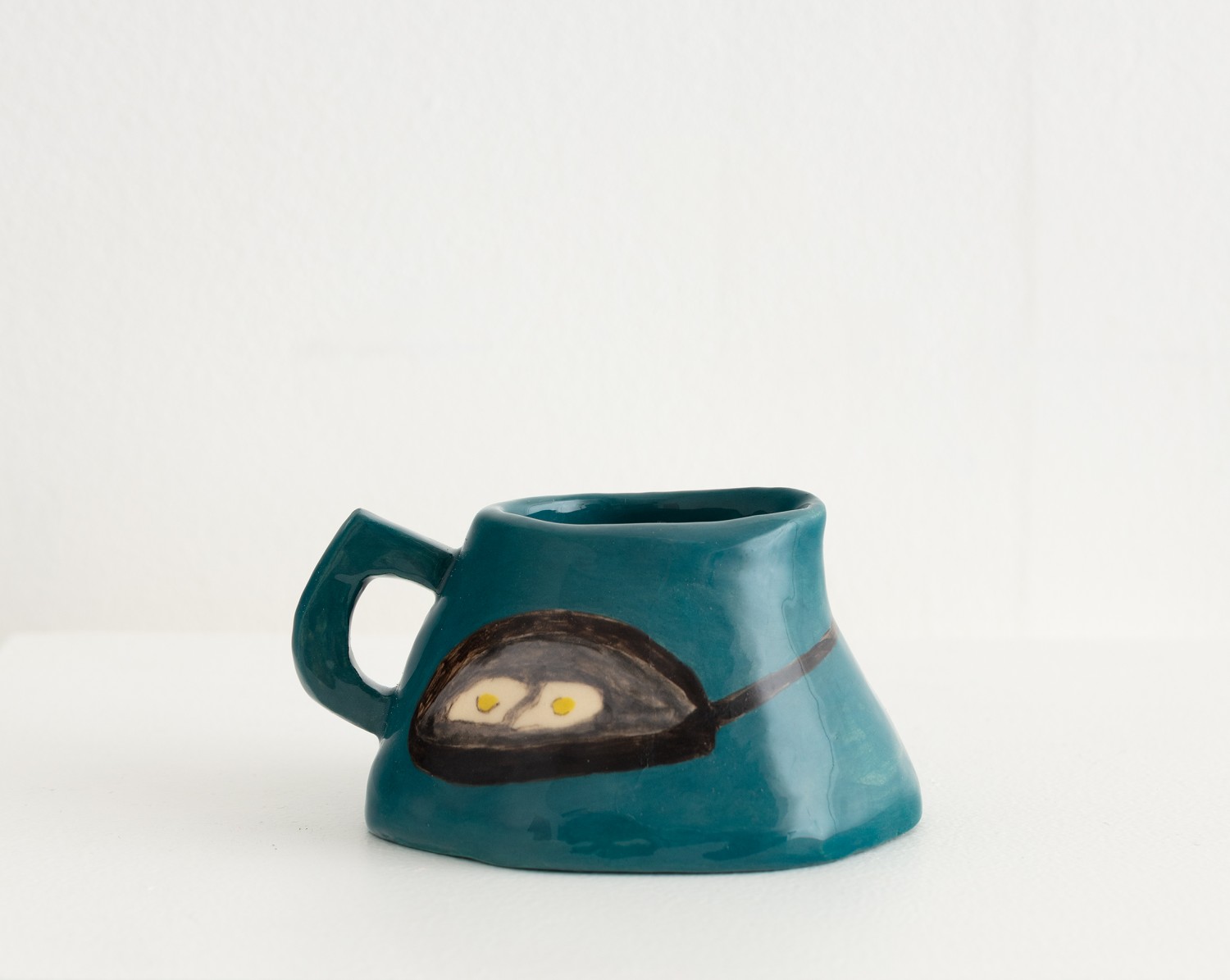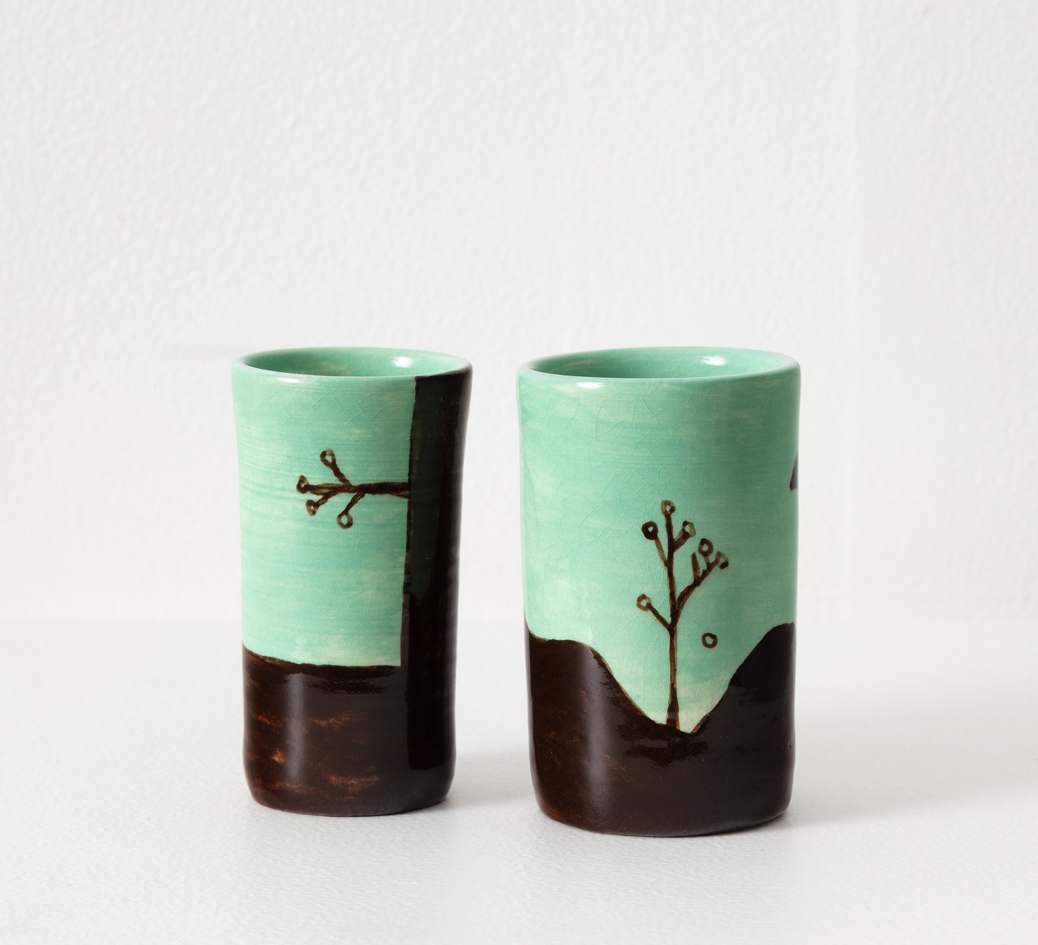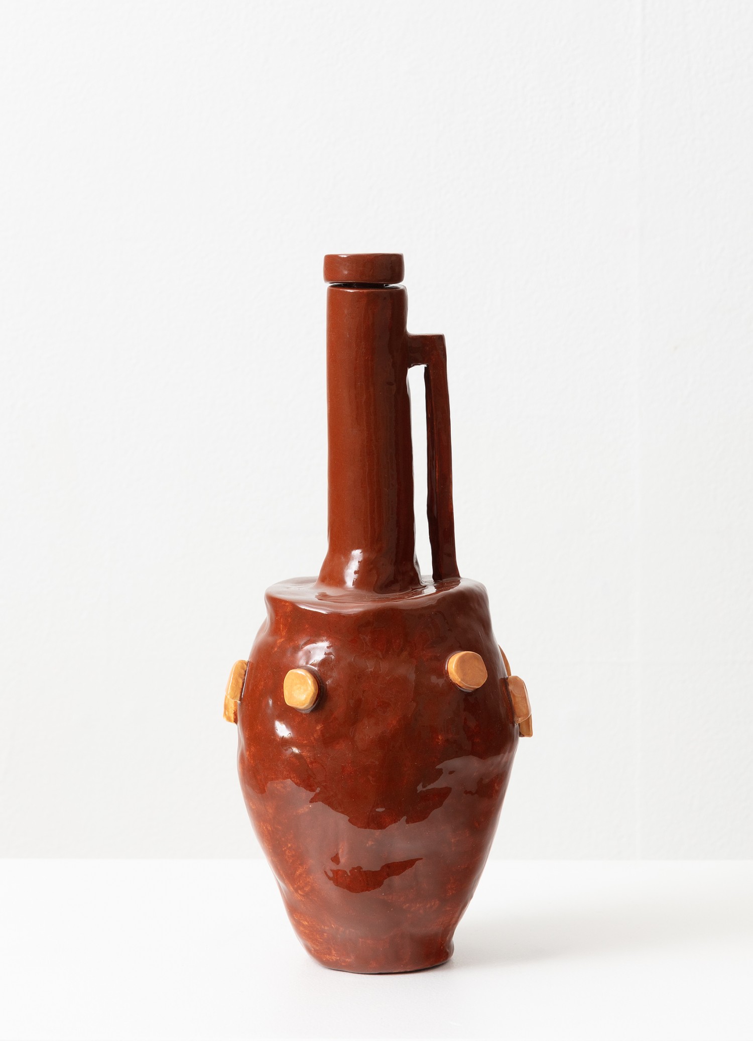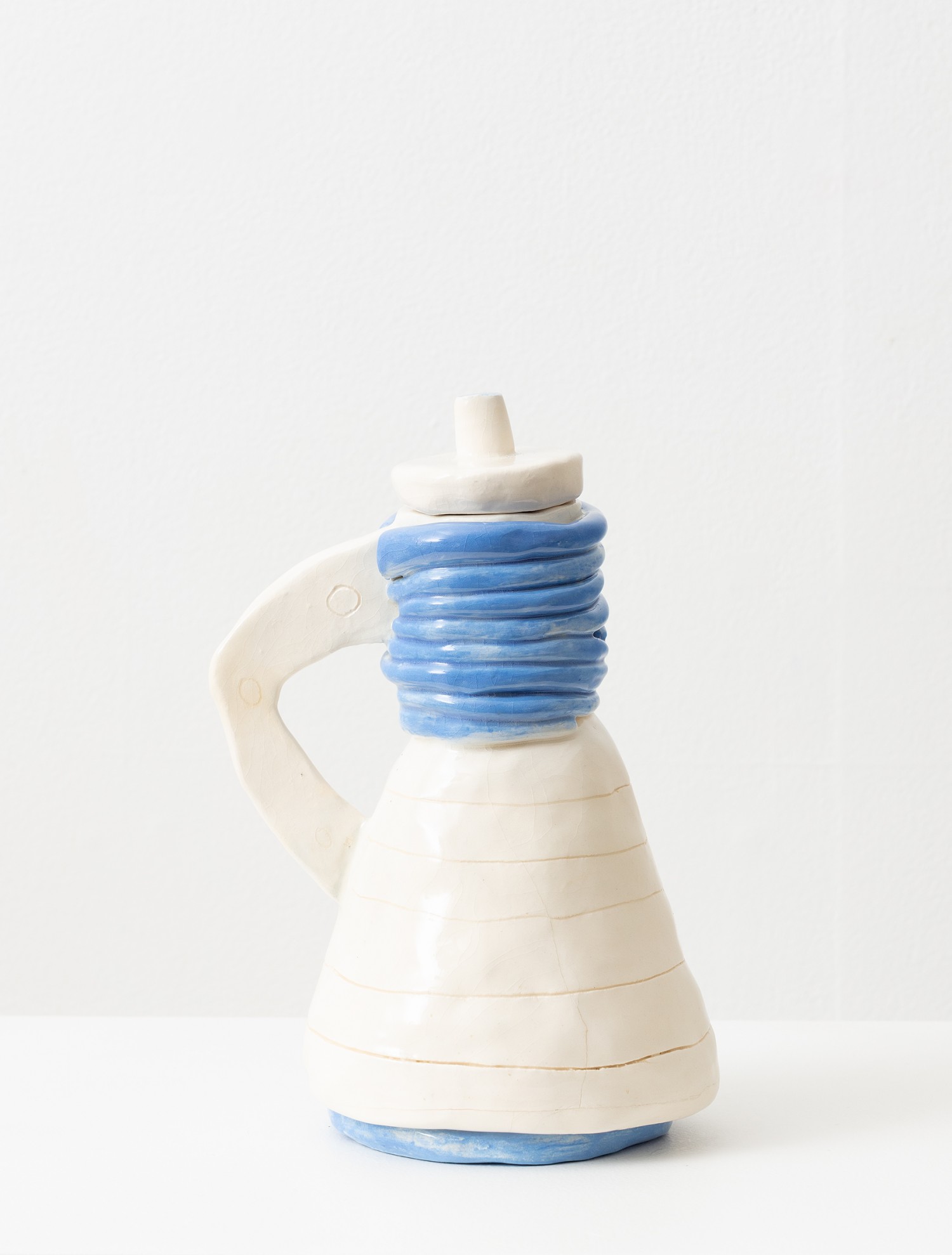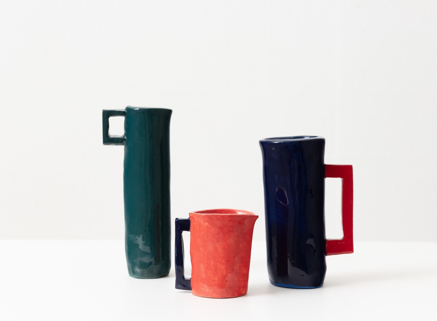 Tall teal-green juglet 2022, Brick red juglet with blue handle 2020, Midnight blue juglet with red handle 2022