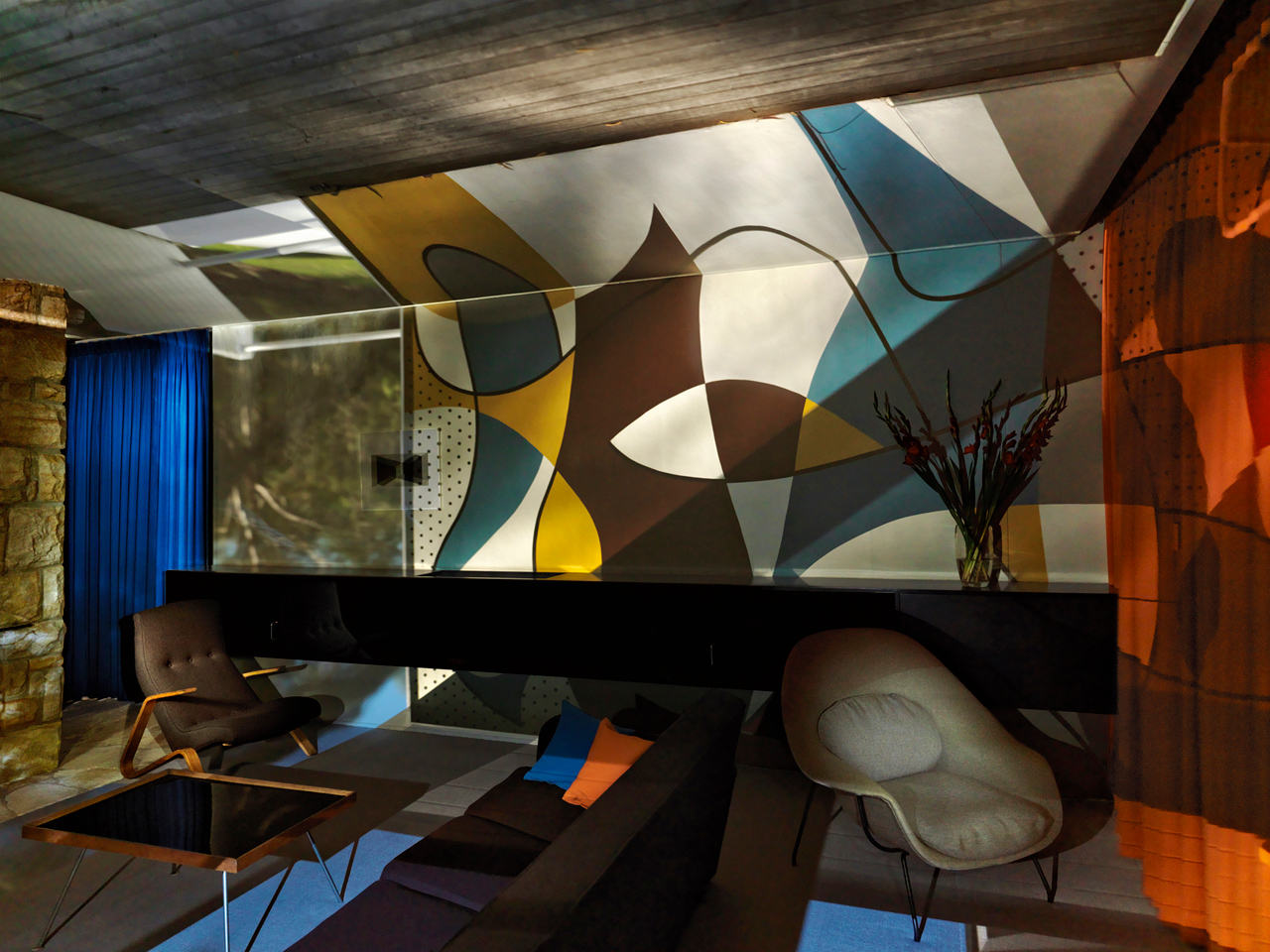 Lounge Room, Rose Seidler House with Exterior Mural