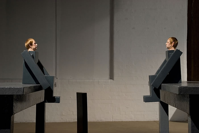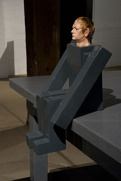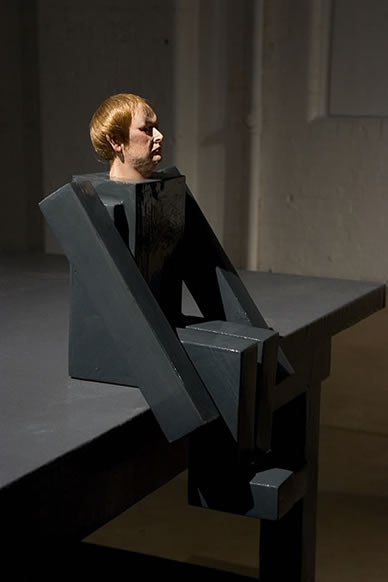 (installation view) wood, polystyrene, polyurethane, resin, paint, monitor, dvd player, amplified speakers
