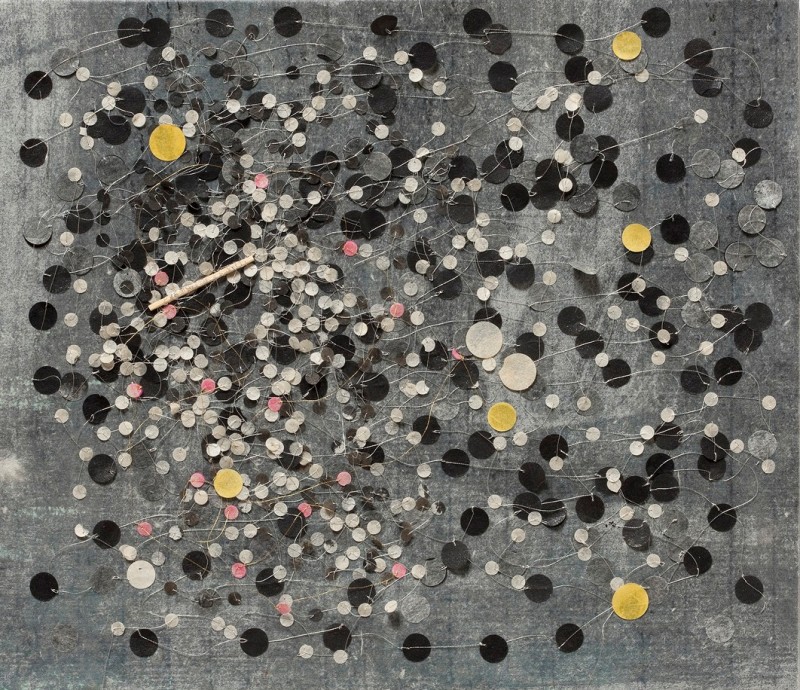 ink, synthetic polymer paint, pigment, watercolour, matchstick, metallic thread, Japanese Kozo natural paper, Fabriano Artistico 640 gsm paper