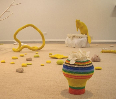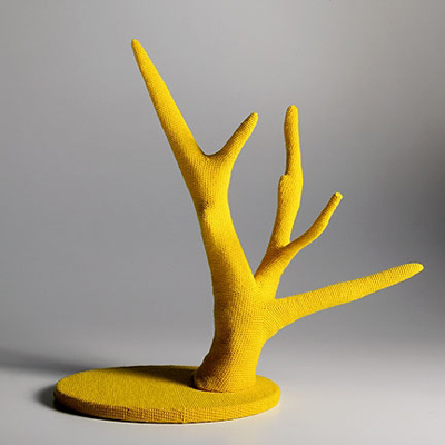hand crocheted lambswool and embroidered cotton thread over high density foam, walnut tree, Japanese rice wine vessels (gourds), ceramic, chromed abs plastic, (Tangle designed by Richard X. Zawitz 1981), Lurex thread, nylon thread, cotton thread, Japanese