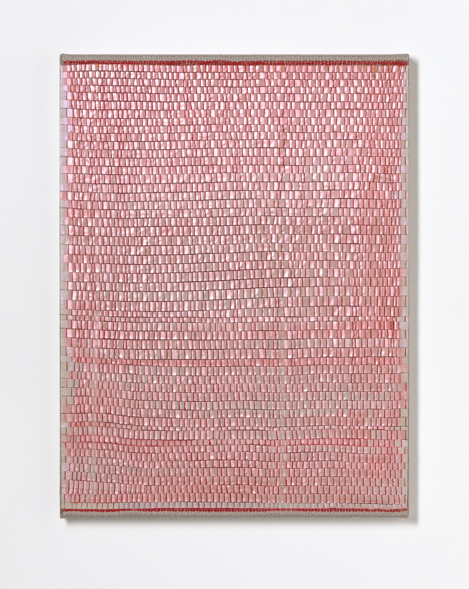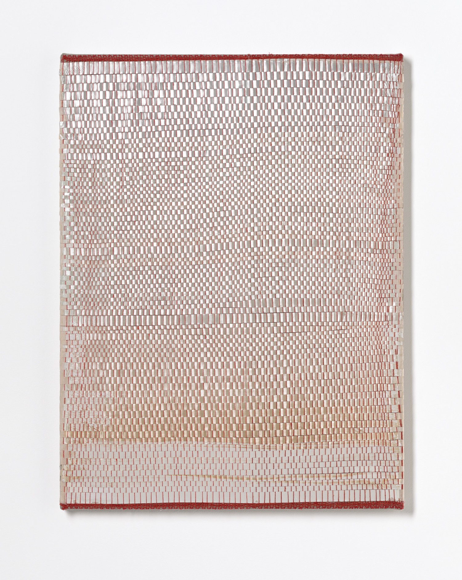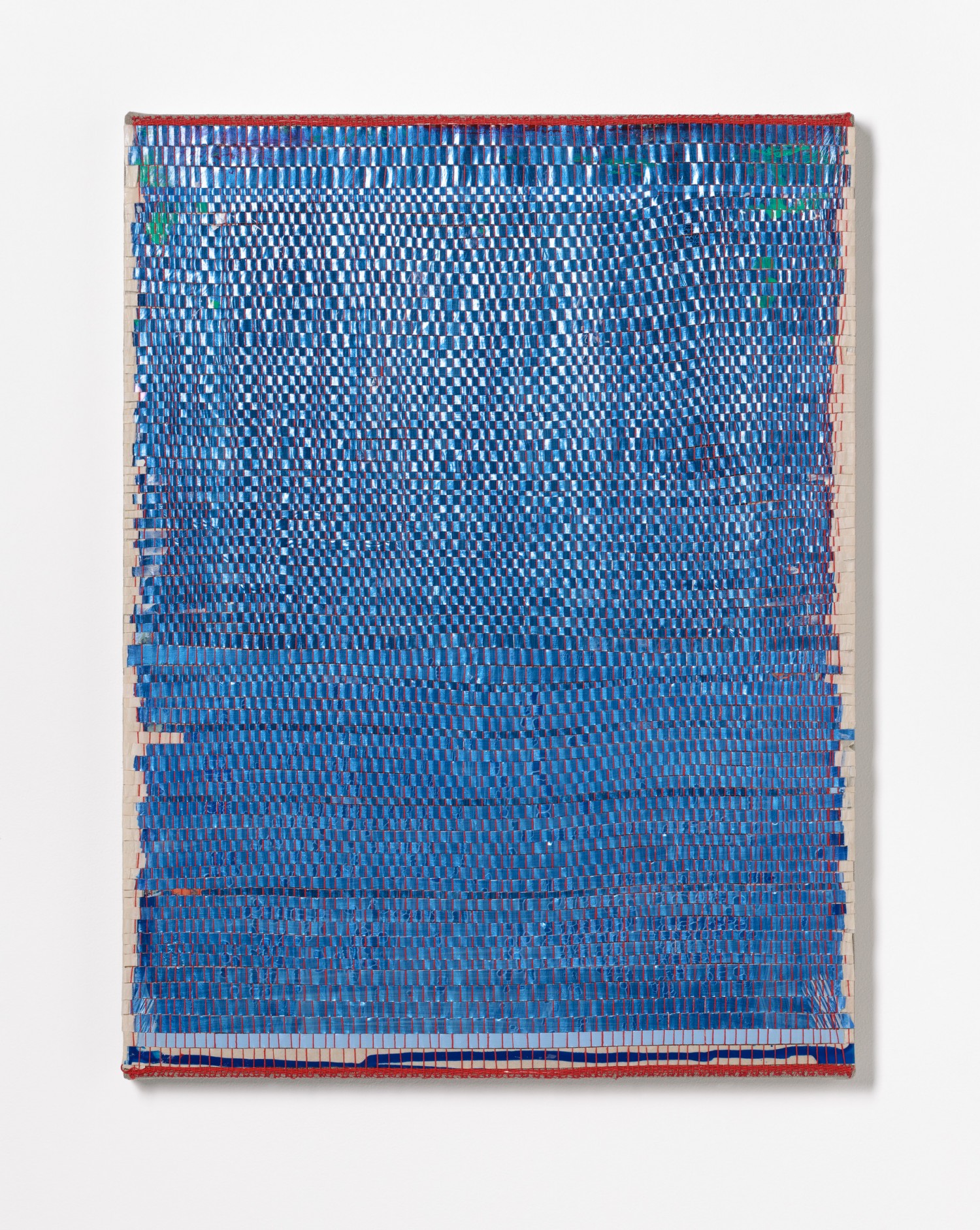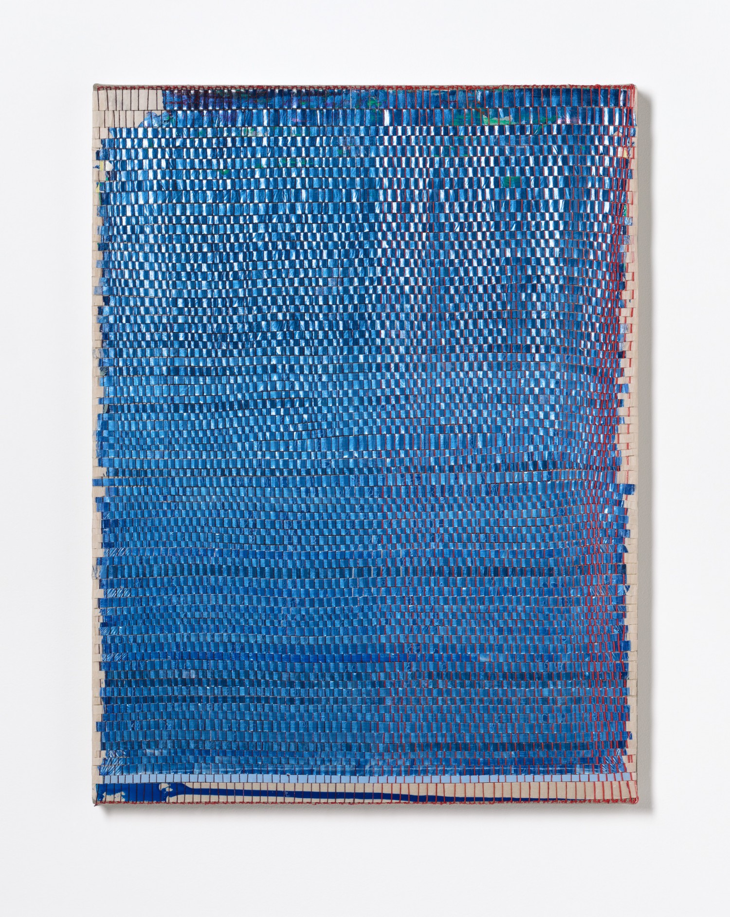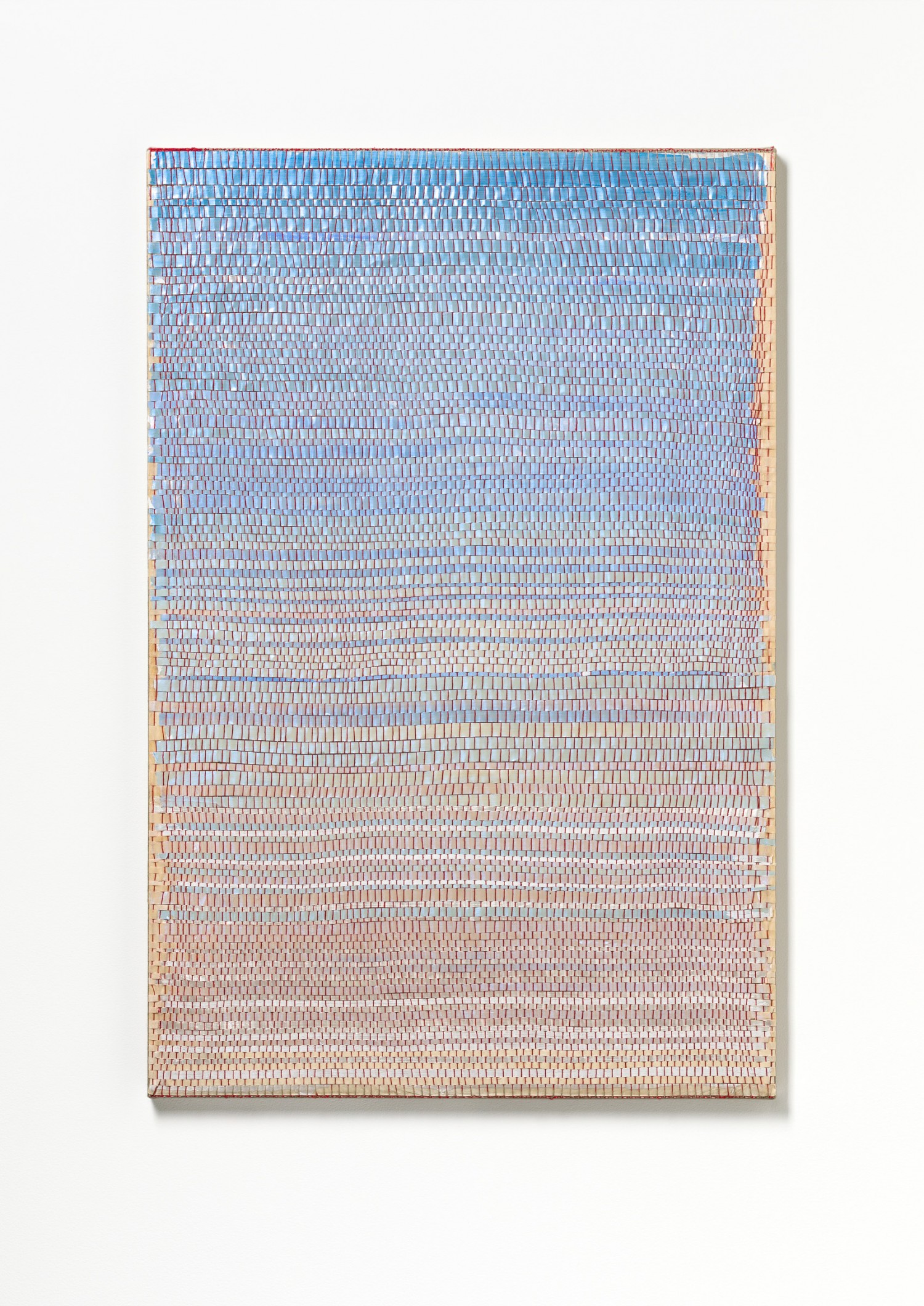 synthetic polymer emulsion, iridescent pigment, micaceous iron oxide, Japanese kozo natural paper, linen and cotton thread on wooden panel
