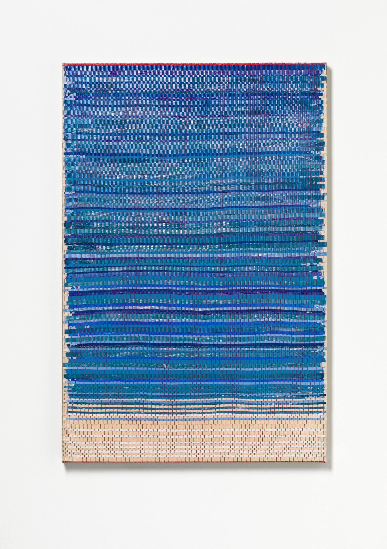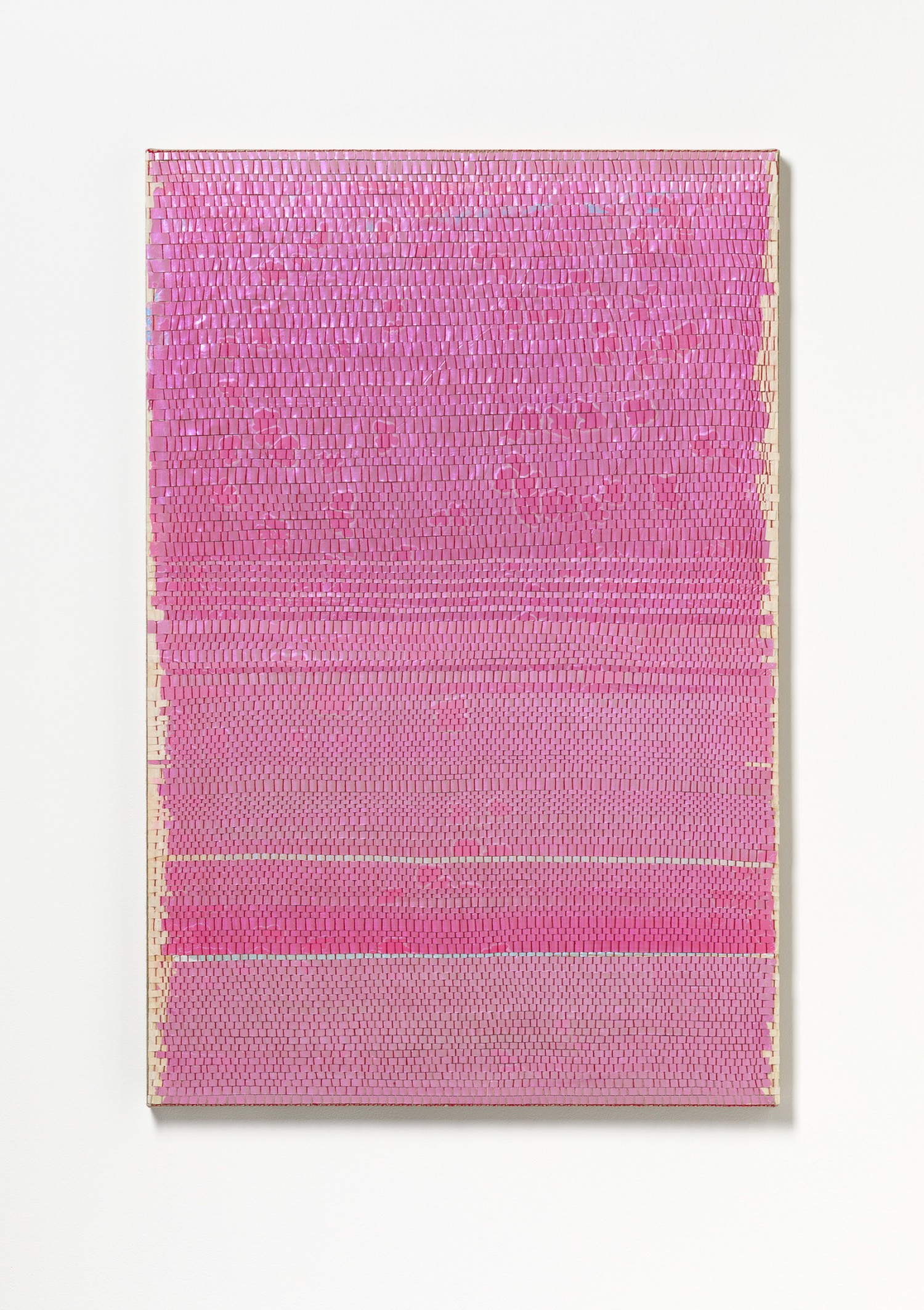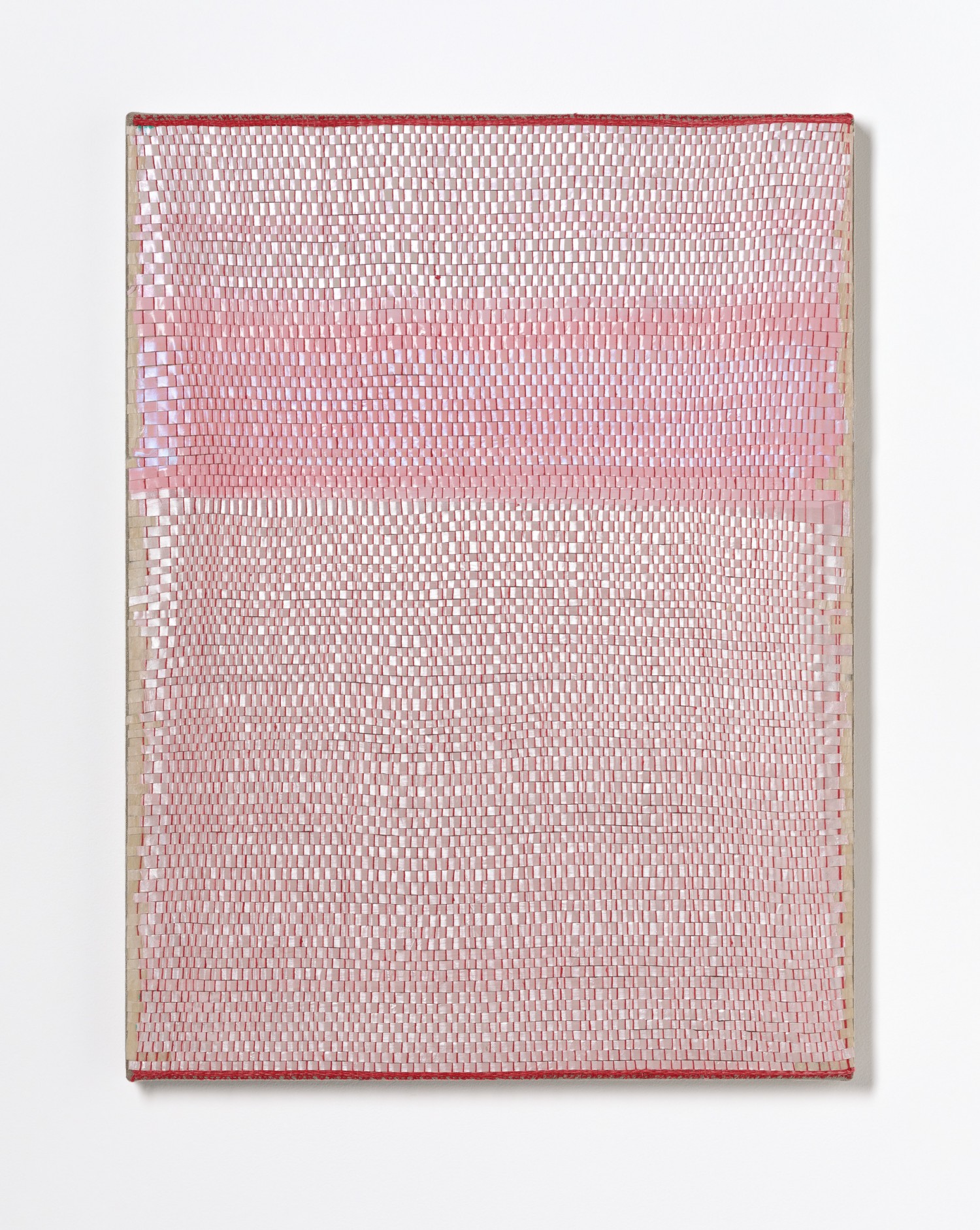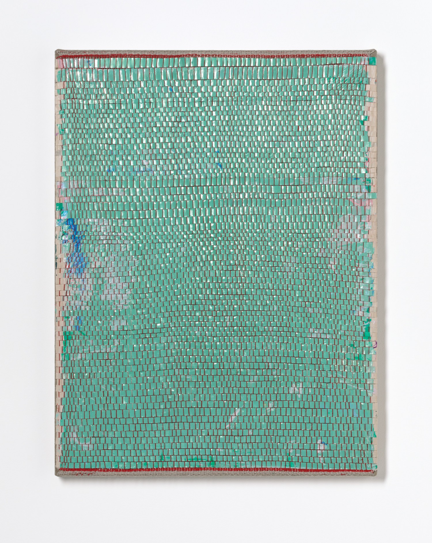 synthetic polymer emulsion, iridescent pigment, micaceous iron oxide, Japanese kozo natural paper, linen and cotton thread on wooden panel