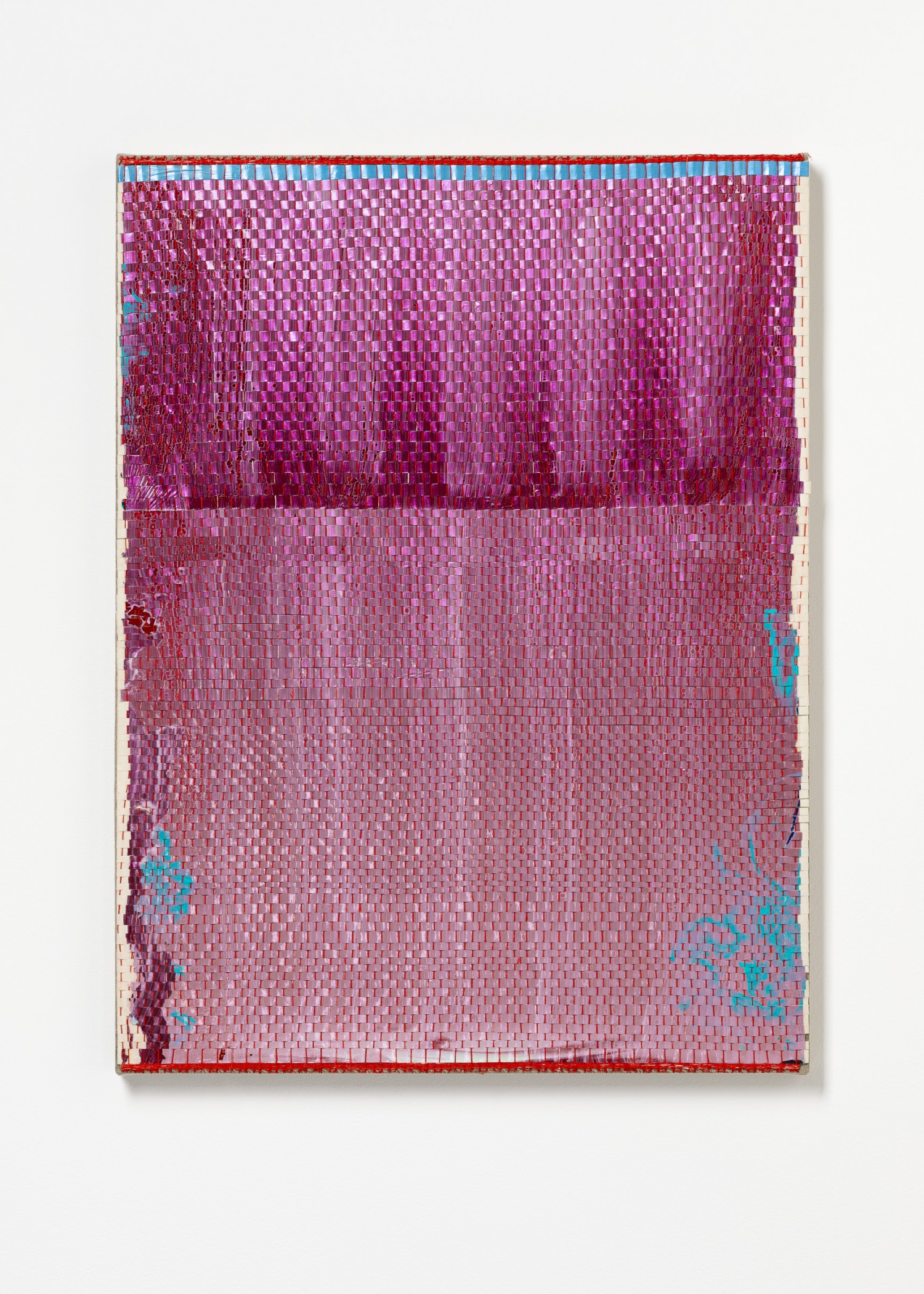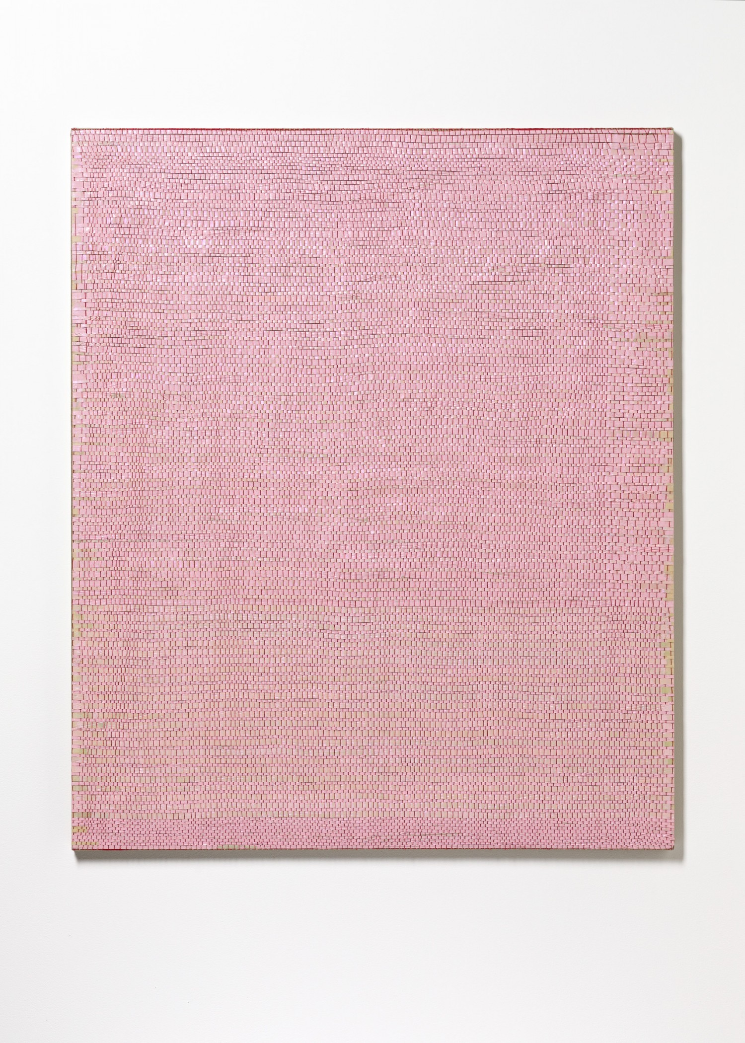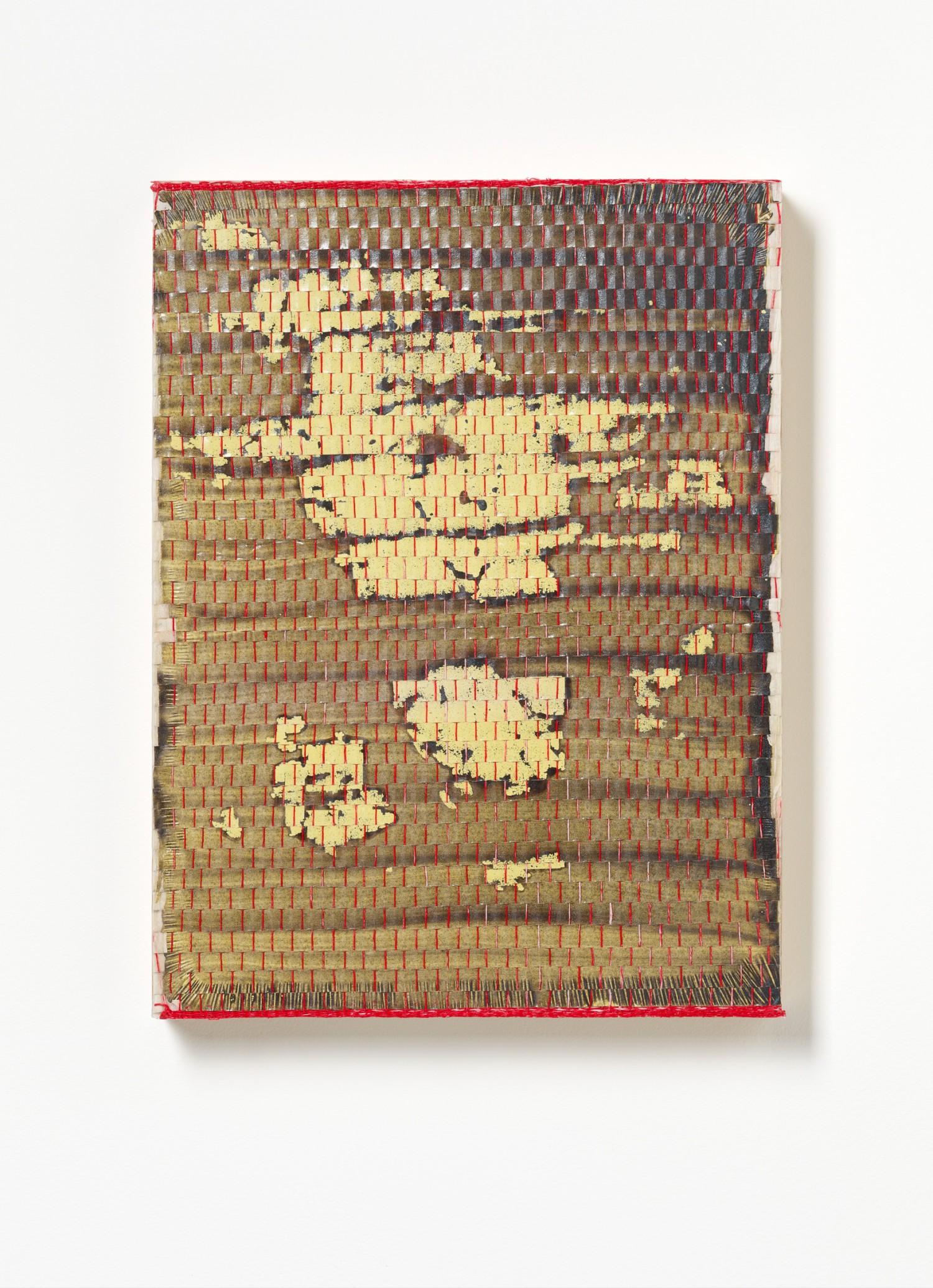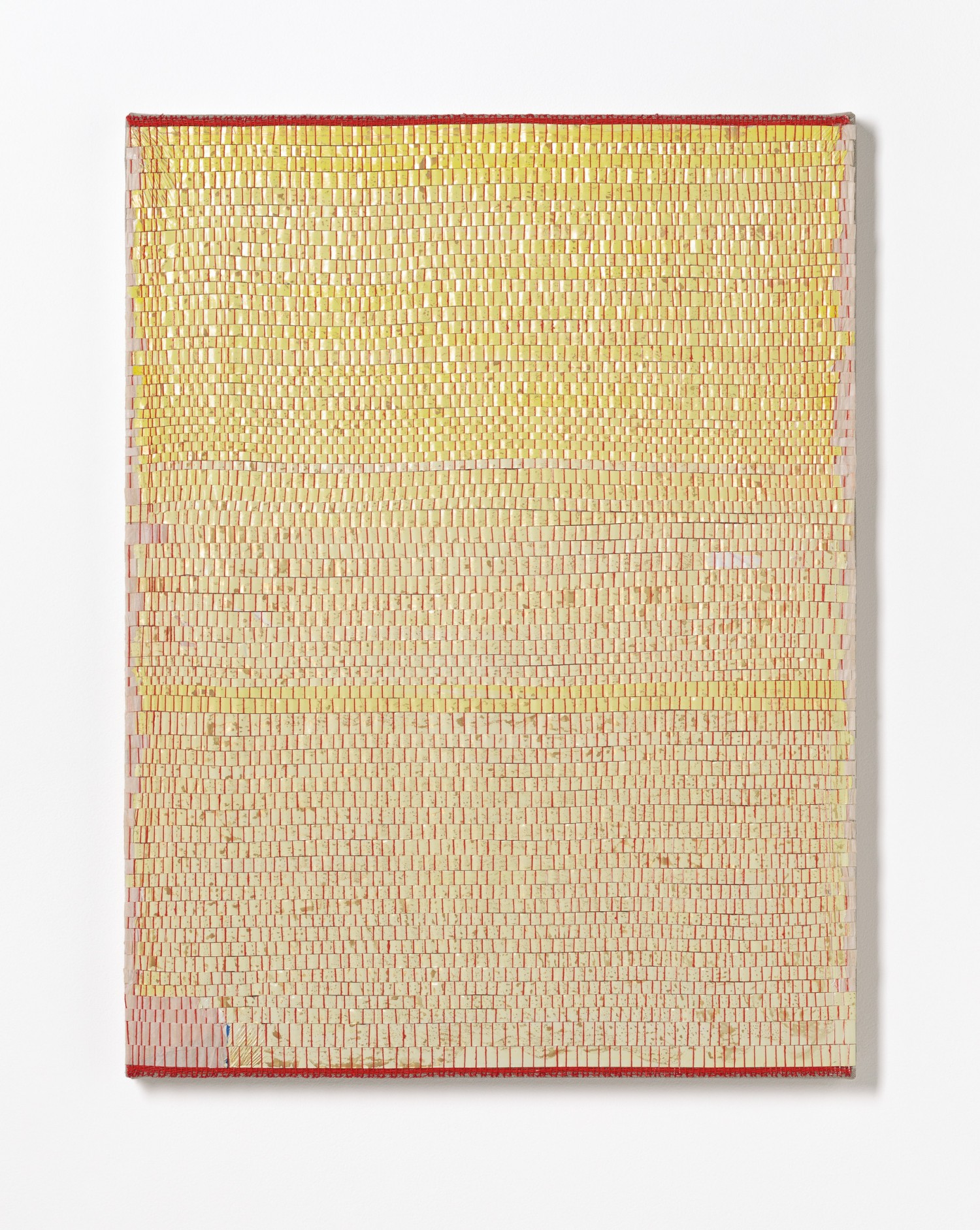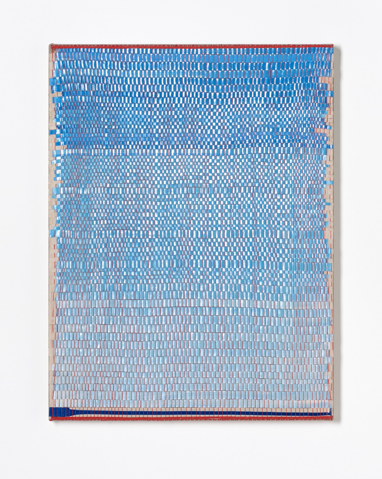 synthetic polymer emulsion, iridescent pigment, micaceous iron oxide, Japanese kozo natural paper, linen and cotton thread on wooden panel