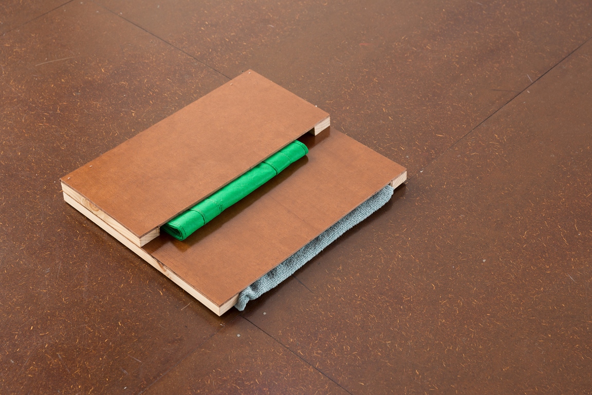 stained and polished Masonite, pine, found fabric